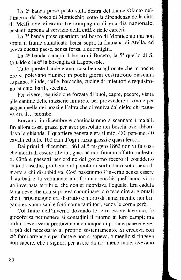Dai primi di dicembre 1861 al 5 maggio 1862 non vi fu cosa che menti di essere riferita, giacché non fummo affatto molestati. Città e paesetti per ordine del governo fecero il cosiddetto stato d'assedio. proibendo al popolo di sortir fuori sotto pena di morte a chi disubbidiva. Così passammo ''inverno senza essere disturbati e fu veramente una fortuna, poiché quell anno vi fu un invernata terribile, che non si ricordava l'eguale. Era caduta tanta neve che non si poteva camminare; ciò fece dire ai giornali che il brigantaggio era distrutto e morto di fame, mentre noi briganti eravamo sani e forti come tanti tori, senza le corna però.