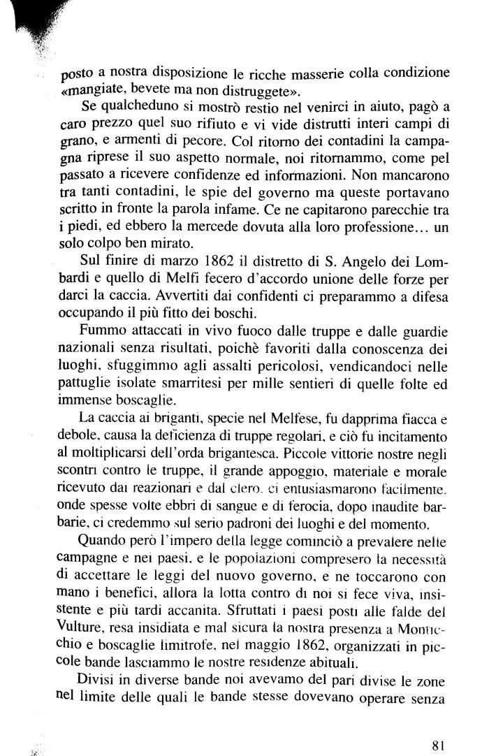 La caccia ai bnganti, specie nel Melfese, fu dapprima fiacca e debole, causa la deficienza di truppe regolari, e ciò fu incitamento al moltipllcarsi dell'orda brigantesca. Piccoie vittorie nostre negli scontri contro le truppe, il grande appoggio, matenale e morale ricevuto dai reazionari e dai clero ci entusiasmarono facilmente, onde spesse volte ebbri di sangue e di ferocia, dopo inaudite barbarie, ci credemmo sul seno padroni dei luoghi e del momento.