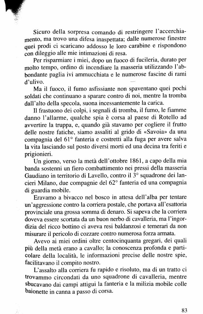 Un giorno, verso la metà dell'ottobre 1861, a capo della mia banda sostenni un fiero combattimento nei pressi della masseria Gaudiano in territorio di Lavello, contro il 3° squadrone dei lancieri Milano, due compagnie del 62° fanteria ed una compagnia di guardia mobile.