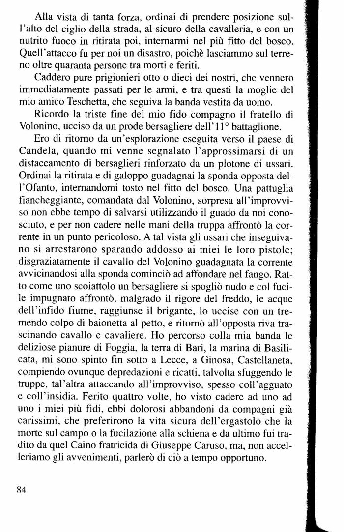 Ero di ritomo da un'esplorazione eseguita verso il paese di Candela, quando mi venne segnalato l'approssimarsi di un distaccamento di bersaglieri rinforzato da un plotone di ussari. Ordinai la ritirata e di galoppo guadagnai la sponda opposta del-l'Ofanto, internandomi tosto nel fitto del bosco. Una pattuglia fiancheggiante, comandata dal Volonino, sorpresa all'improvviso non ebbe tempo di salvarsi utilizzando il guado da noi conosciuto, e per non cadere nelle mani della truppa affrontò la corrente in un punto pericoloso. A tal vista gli ussari che inseguivano si arrestarono sparando addosso ai miei le loro pistole; disgraziatamente il cavallo del Volonino guadagnata la corrente avvicinandosi alla sponda cominciò ad affondare nel fango. Ratto come uno scoiattolo un bersagliere si spogliò nudo e col fucile impugnato affrontò, malgrado il rigore del freddo, le acque dell'infido fiume, raggiunse il brigante, lo uccise con un tremendo colpo di baionetta al petto, e ritornò all'opposta riva trascinando cavallo e cavaliere. Ho percorso colla mia banda le deliziose pianure di Foggia, la terra di Bari, la marina di Basilicata, mi sono spinto fin sotto a Lecce, a Ginosa, Castellaneta, compiendo ovunque depredazioni e ricatti, talvolta sfuggendo le truppe, tal'altra attaccando all'improvviso, spesso coll'agguato e coli'insidia. Ferito quattro volte, ho visto cadere ad uno ad uno i miei più fidi, ebbi dolorosi abbandoni da compagni già carissimi, che preferirono la vita sicura dell'ergastolo che la morte sul campo o la fucilazione alla schiena e da ultimo fui tradito da quel Caino fratricida di Giuseppe Caruso, ma, non acceleriamo gli avvenimenti, parlerò di ciò a tempo opportuno.