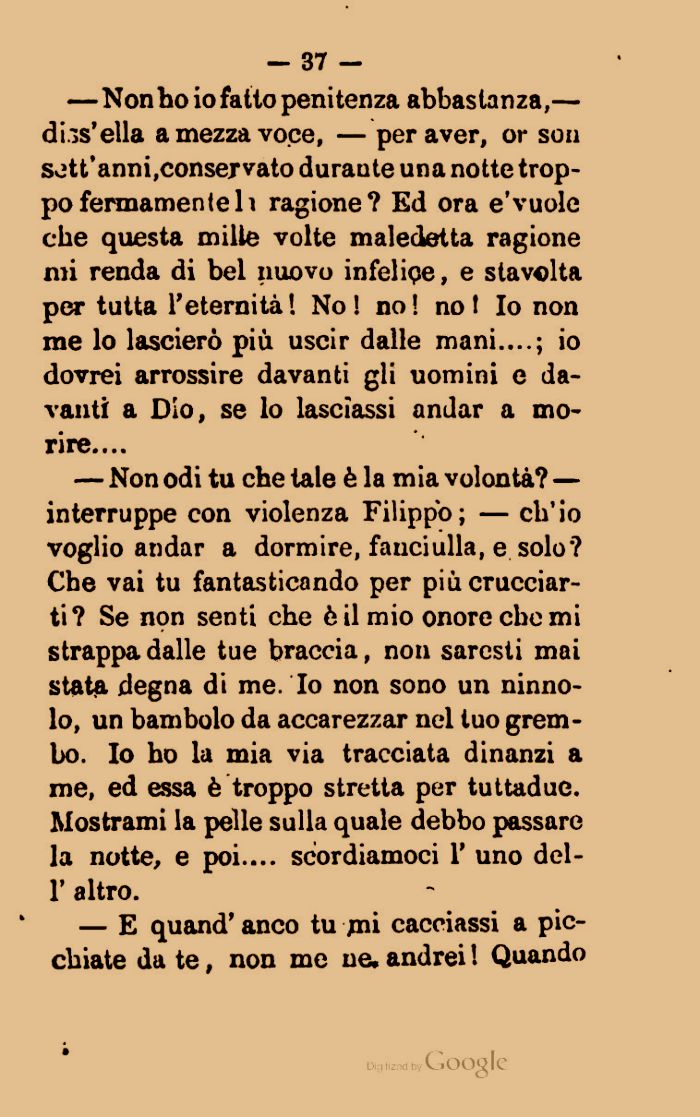 —Non ho io fallo penitenza abbastanza,— diòs'ella a mezza voce, — per aver, or son sett'anni,conservato durante una notte troppo fermamente li ragione? Kd ora e'vuole che questa mille volte maledetta ragione mi renda di bel nuovo infelice, e stavolta per tutta l'eternità! No! no! noi Io non me lo lascierò più uscir dalle mani....; io dovrei arrossire davanti gli uomini e davanti a Dio, se lo lasciassi andar a morire....