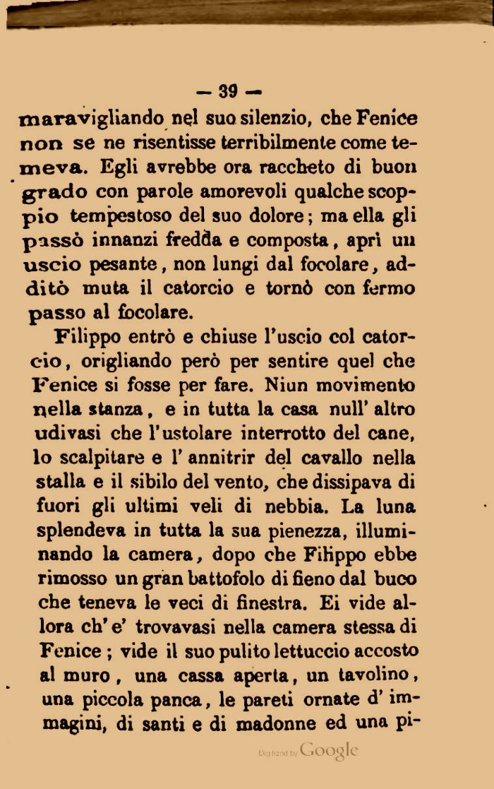 Filippo entrò e chiuse l'uscio col catorcio , origliando però per sentire quel che Fenice si fosse per fare. Niun movimento nella stanza, e in tutta la casa nuli' altro udivasi che l'ustolare interrotto del cane, lo scalpitare e 1' annitrir del cavallo nella stalla e il sibilo del vento, che dissipava di fuori gli ultimi veli di nebbia. La luna splendeva in tutta la sua pienezza, illuminando la camera, dopo che Filippo ebbe rimosso un gran battofolo di fieno dal buco che teneva le veci di finestra. Ei vide allora eh' e' trovavasi nella camera stessa di Fenice ; vide il suo pulito lettuccio accosto al muro , una cassa aperta, un tavolino, una piccola panca, le pareti ornate d'immagini, di santi e di madonne ed una pi-i .....