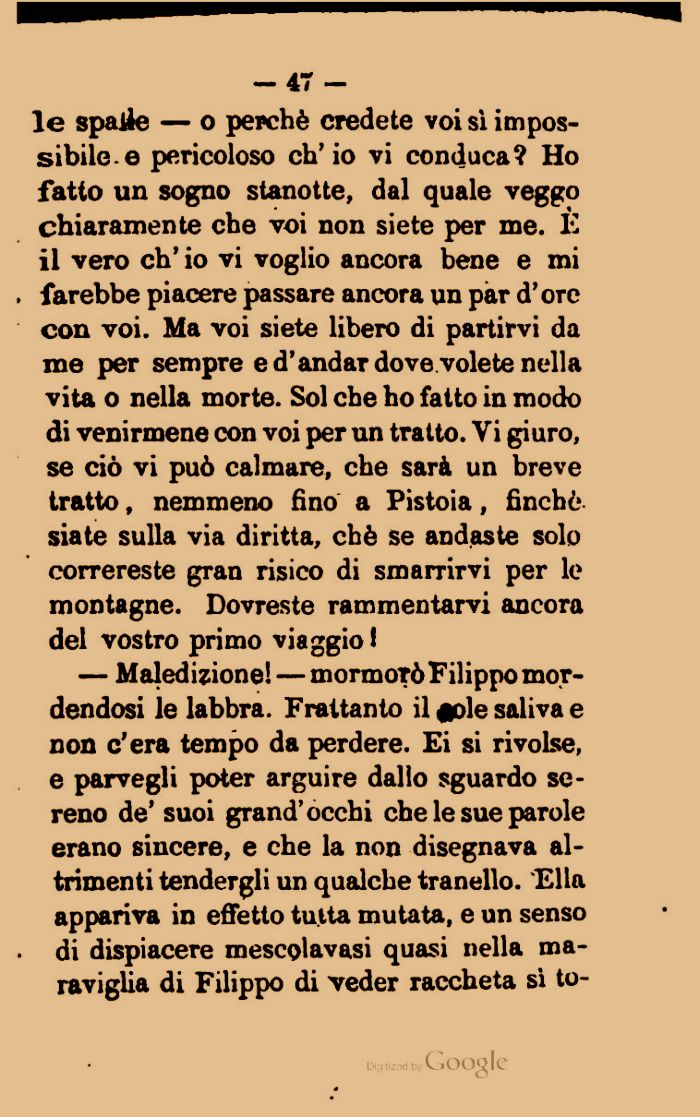 — irle spalle — o perchè credete voi si impossibile, e pericoloso ch'io vi conduca? Ho fatto un sogno stanotte, dal quale veggo chiaramente che voi non siete per me. E il vero eh' io vi voglio ancora bene e mi farebbe piacere passare ancora un par d'ore con voi. Ma voi siete libero di partirvi da me per sempre e d'andar dove volete nella vita o nella morte. Sol che ho fatto in modo di venirmene con voi per un tratto. Vi giuro, se ciò vi può calmare, che sarà un breve tratto, nemmeno fino a Pistoia , finché siate sulla via diritta, chè se andaste solo correreste gran risico di smarrirvi per le montagne. Dovreste rammentarvi ancora del vostro primo viaggio I ![]() |
