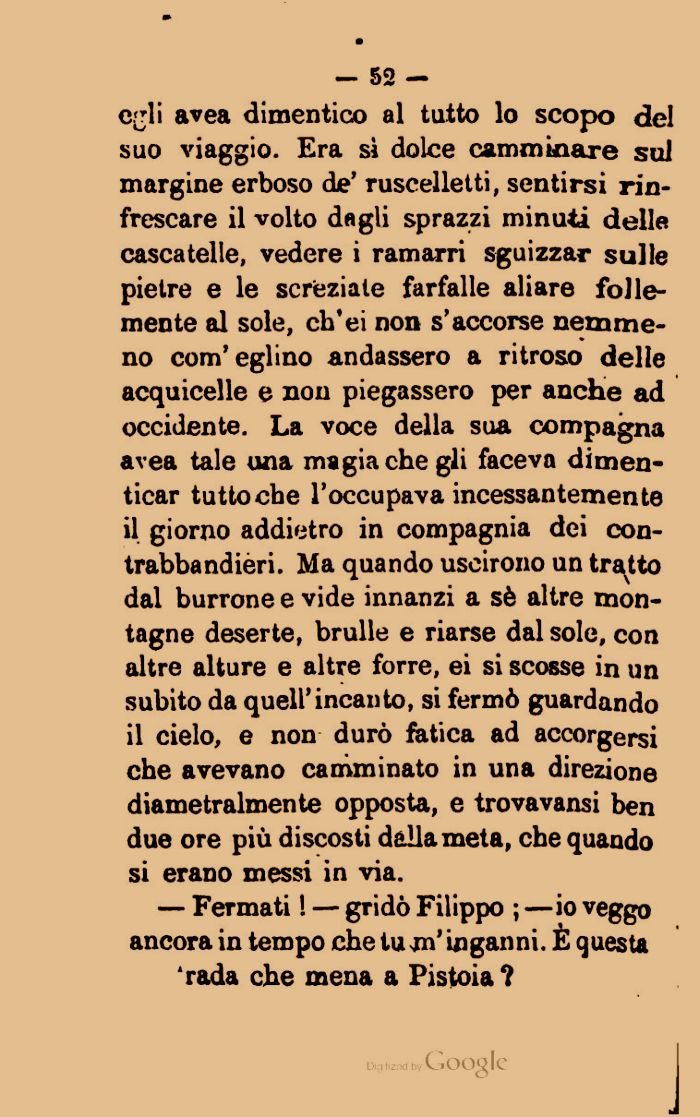 — Fermati l — gridò Filippo ; —io veggo ancora in tempo che tu m'inganni. È questa 'rada che mena a Pistoia ?
