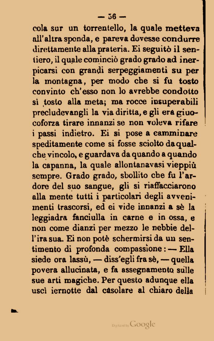 cola sur un torrentello, la quale metteva all'altra sponda, e pareva dovesse condurre direttamente alla prateria. Ei seguitò il sentiero, il quale cominciò grado grado ad inerpicarsi con grandi serpeggiamenti su per la montagna, per modo che si fu tosto convinto ch'esso non lo avrebbe condotto si tosto alla meta; ma rocce insuperabili precludevangli la via diritta, e gli era giocoforza tirare innanzi se non voleva rifare i passi indietro. Ei si pose a camminare speditamente come si fosse sciolto da qualche vincolo, e guardava da quando a quando la capanna, la quale allontanavasi vieppiù sempre. Grado grado, sbollito che fu l'ardore del suo sangue, gli si riaffacciarono alla mente tutti i particolari degli avvenimenti trascorsi, ed ei vide innanzi a sè la leggiadra fanciulla in carne e in ossa, e non come dianzi per mezzo le nebbie dell'ira sua. Einon potè schermirsi da un sentimento di profonda compassione : — Ella siede ora lassù, — diss'egli fra sè, — quella povera allucinata, e fa assegnamento sulle sue arti magiche. Per questo adunque ella uscì iernotte dal casolare al chiaro della !