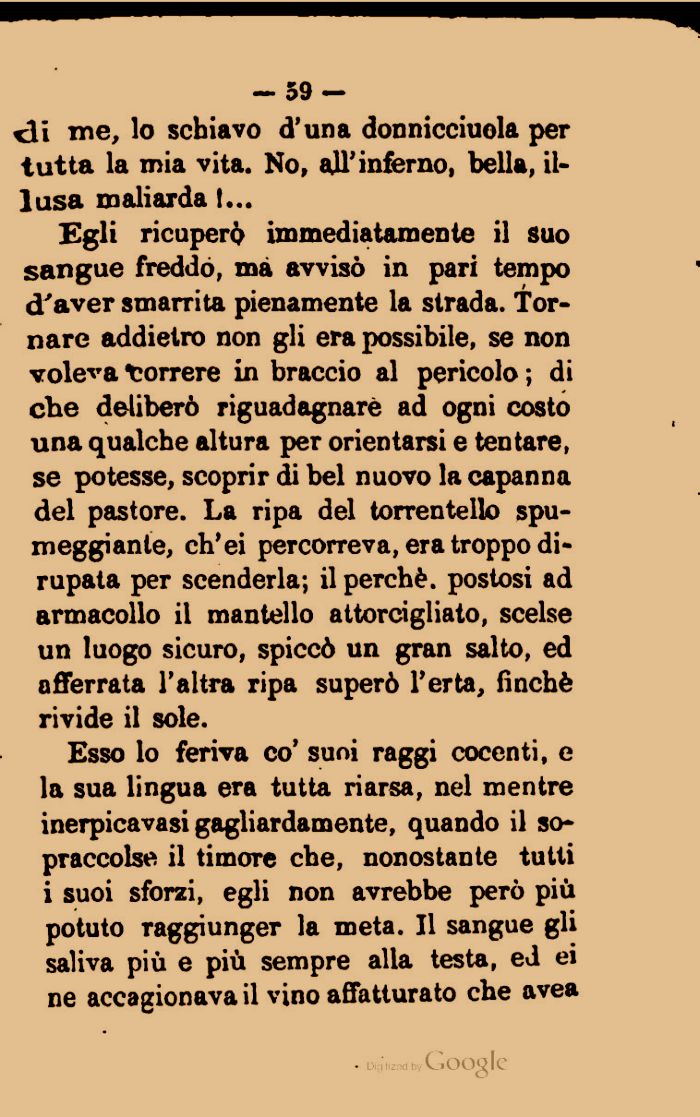 Esso lo feriva co' suoi raggi cocenti, e la sua lingua era tutta riarsa, nel mentre inerpicavasi gagliardamente, quando il sopraccolse il timore che, nonostante tutti i suoi sforzi, egli non avrebbe però più potuto raggiunger la meta. Il sangue gli saliva più e più sempre alla testa, ed ei ne accagionava il vino affatturato che avea
