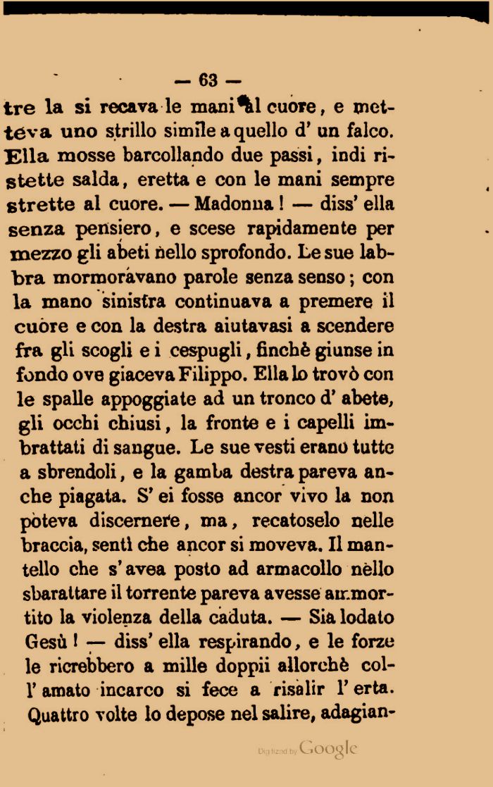 tre la si recava le manici cuore, e metteva uno strillo simile a quello d' un falco. Ella mosse barcollando due passi, indi ristette salda, eretta e con le mani sempre strette al cuore. — Madonna l — diss' ella senza pensiero, e scese rapidamente per mezzo gli abeti nello sprofondo. Le sue labbra mormoravano parole senza senso ; con la mano sinistra continuava a premere il cuòre e con la destra aiutavasi a scendere fra gli scogli e i cespugli, finché giunse in fondo ove giaceva Filippo. Ella lo trovò con le spalle appoggiate ad un tronco d' abete, gli occhi chiusi, la fronte e i capelli imbrattati di sangue. Le sue vesti erano tutte a sbrendoli, e la gamba destra pareva anche piagata. S' ei fosse ancor vivo la non poteva discernere, ma, recatoselo nelle braccia, senti che ancor si moveva. Il mantello che s'avea posto ad armacollo nello sbarattare il torrente pareva avesse ammortito la violenza della caduta. — Sia lodato Gesù I — diss' ella respirando, e le forze le ricrebbero a mille doppii allorché col-1' amato incarco si fece a risalir l'erta. Quattro volte lo depose nel sabre, adagian-