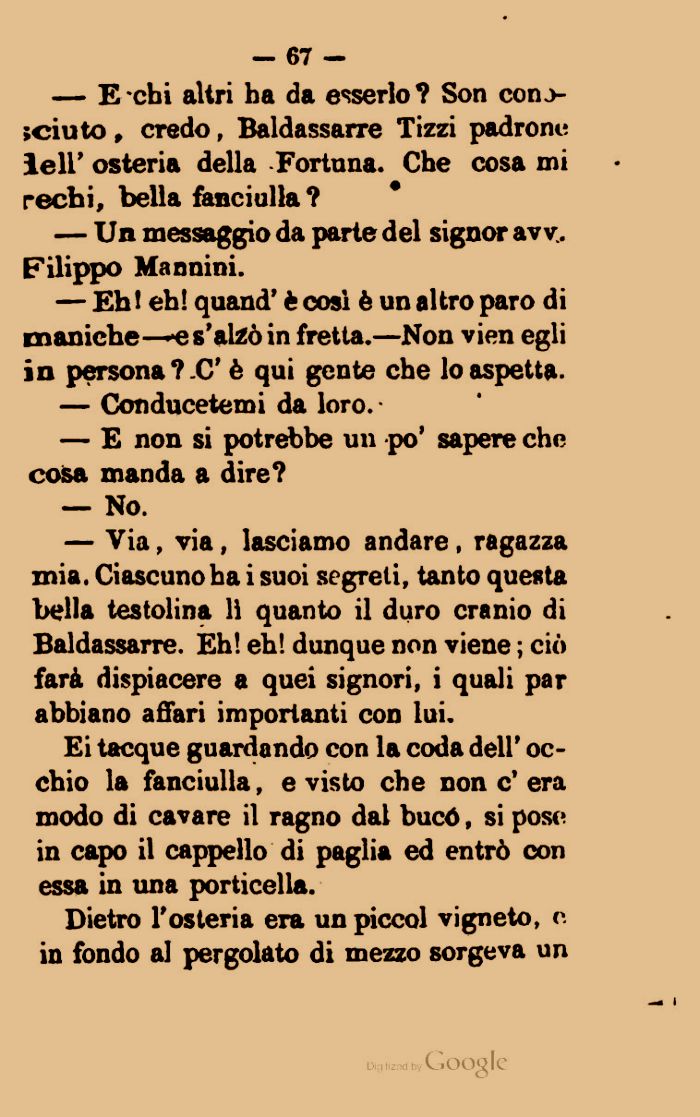 Ei tacque guardando con la coda dell' occhio la fanciulla, e visto che non c' era modo di cavare il ragno dal bucò, si posi; in capo il cappello di paglia ed entrò con essa in una porticella.