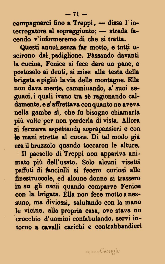 Questi annui senza far motto, e tutti u-scirono dal, padiglione. Passando davanti la cucina. Fenice si fece dare un pane, e postoselo ai denti, si mise alla testa della brigata e pigliò la via delle montagne. Ella non dava mente, camminando, a' suoi seguaci, i quali ivano tra sè ragionando caldamente, e s'affrettava con quanto ne aveva nella gambe sì, che fu bisogno chiamarla più volte per non perderla di vista. Allora si fermava aspettando soprapensieri e con le mani strette al cuore. Di tal modo già era il bruzzolo quando toccaron le alture.