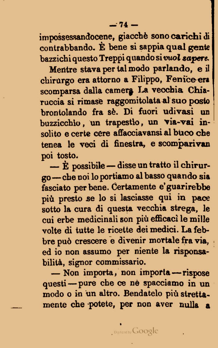 — È possibile — disse un tratto il chirurgo —che noi lo portiamo al basso quando sia fasciato perbene. Certamente e'guarirebbe più presto se lo si lasciasse qui in pace sotto la cura di questa vecchia strega, le cui erbe medicinali son più efficaci le mille volte di tutte le ricette dei medici. La febbre può crescere e divenir mortale fra via, ed io non assumo per niente la risponsa-bilità, signor commissario.