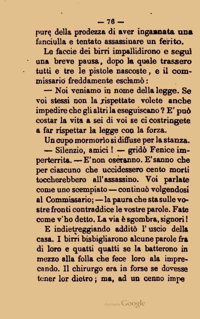 — Silenzio, amici ! — gridò Fenice imperterrita.— E'non oseranno. E'sanno che per ciascuno che uccidessero cento morti toccherebbero all'assassino. Voi parlate come uno scempiato — continuò volgendosi al Commissario; — la paura che sta sulle vostre fronti contraddice le vostre parole. Fate come v'ho detto. La via è sgombra, signori I
