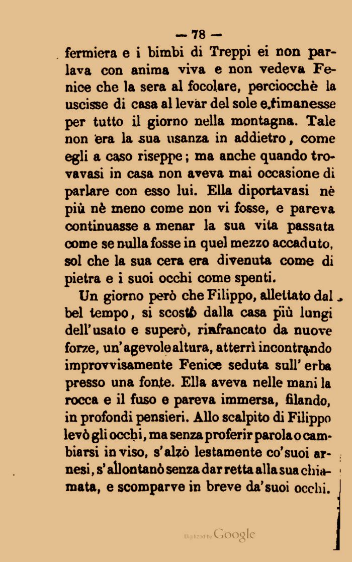 Un giorno però che Filippo, allettato dal ^ bel tempo, si scostò dalla casa più lungi dell'usato e superò, rinfrancato da nuove forze, un'agevolealtura, atterrì incontrando improvvisamente Fenice seduta sull' erba presso una fonte. Ella aveva nelle mani la rocca e il fuso e pareva immersa, filando, in profondi pensieri. Allo scalpito di Filippo levò gli occhi, ma senza proferir parolao cambiarsi inviso, s'alzò lestamente co'suoi arnesi , s'allontanò senza dar retta alla sua chiamata, e scomparve in breve da'suoi occhi. I