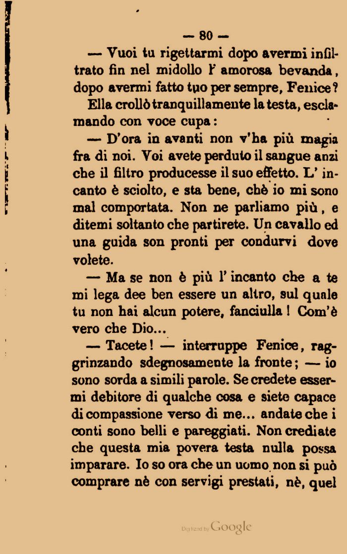 — Tacete l — interruppe Fenice, raggrinzando sdegnosamente la fronte ; — io sono sorda a simili parole. Se credete essermi debitore di qualche cosa e siete capace di compassione verso di me... andate che i conti sono belli e pareggiati. Non crediate che questa mia povera testa nulla possa imparare. Io so ora che un uomo non si può comprare nè con servigi prestati, nè, quel