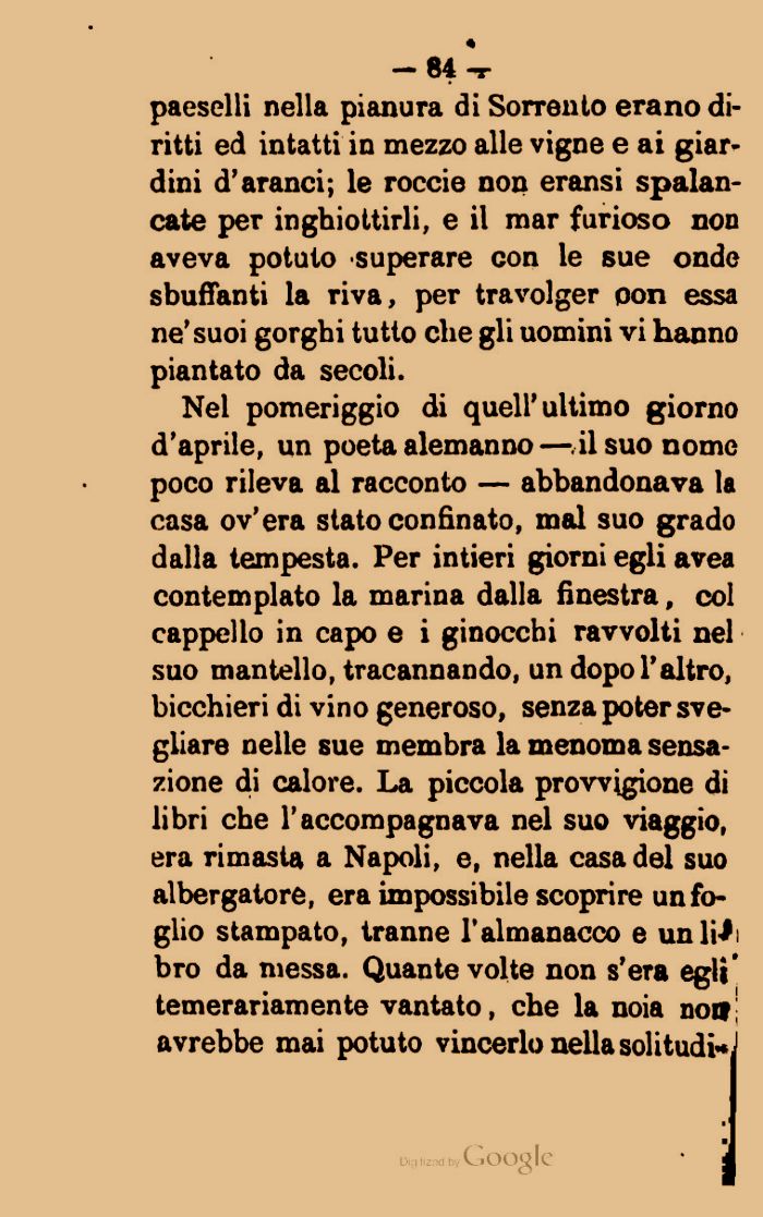 Nel pomeriggio di quell'ultimo giorno d'aprile, un poeta alemanno — il suo nome poco rileva al racconto — abbandonava la casa ov'era stato confinato, mal suo grado dalla tempesta. Per intieri giorni egli avea contemplato la marina dalla finestra, col cappello in capo e i ginocchi ravvolti nel suo mantello, tracannando, un dopo l'altro, bicchieri di vino generoso, senza poter svegliare nelle sue membra la menoma sensazione di calore. La piccola provvigione di libri che l'accompagnava nel suo viaggio, era rimasta a Napoli, e, nella casa del suo albergatore, era impossibile scoprire un foglio stampato, tranne l'almanacco e un lì-J bro da messa. Quante volte non s'era egli temerariamente vantato, che la noia non avrebbe mai potuto vincerlo nella soliti