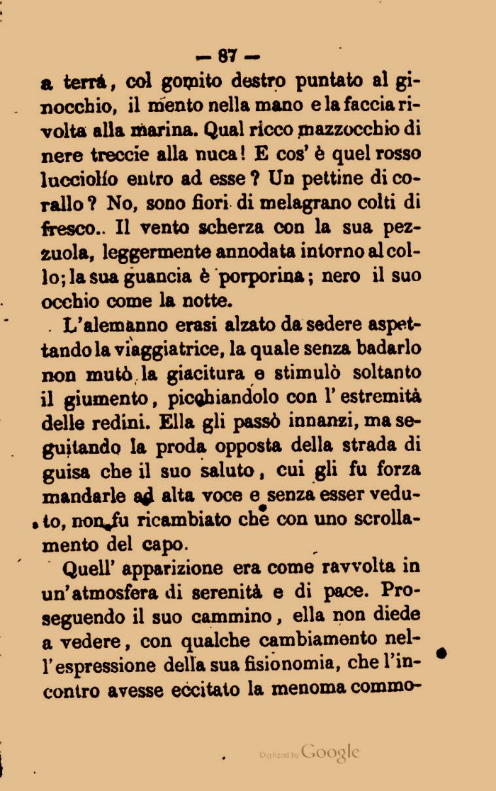 a terrà, col gomito destro puntato al ginocchio, il mento nella mano e la faccia rivolta alla marina. Qual ricco mazzocchio di nere treccie alla nuca ! E cos' è quel rosso lucciolio entro ad esse ? Un pettine di corallo ? No, sono fiori di melagrano colti di fresco.. Il vento scherza con la sua pezzuola, leggermente annodata intorno al collo; la sua guancia è porporina; nero il suo occhio come la notte.