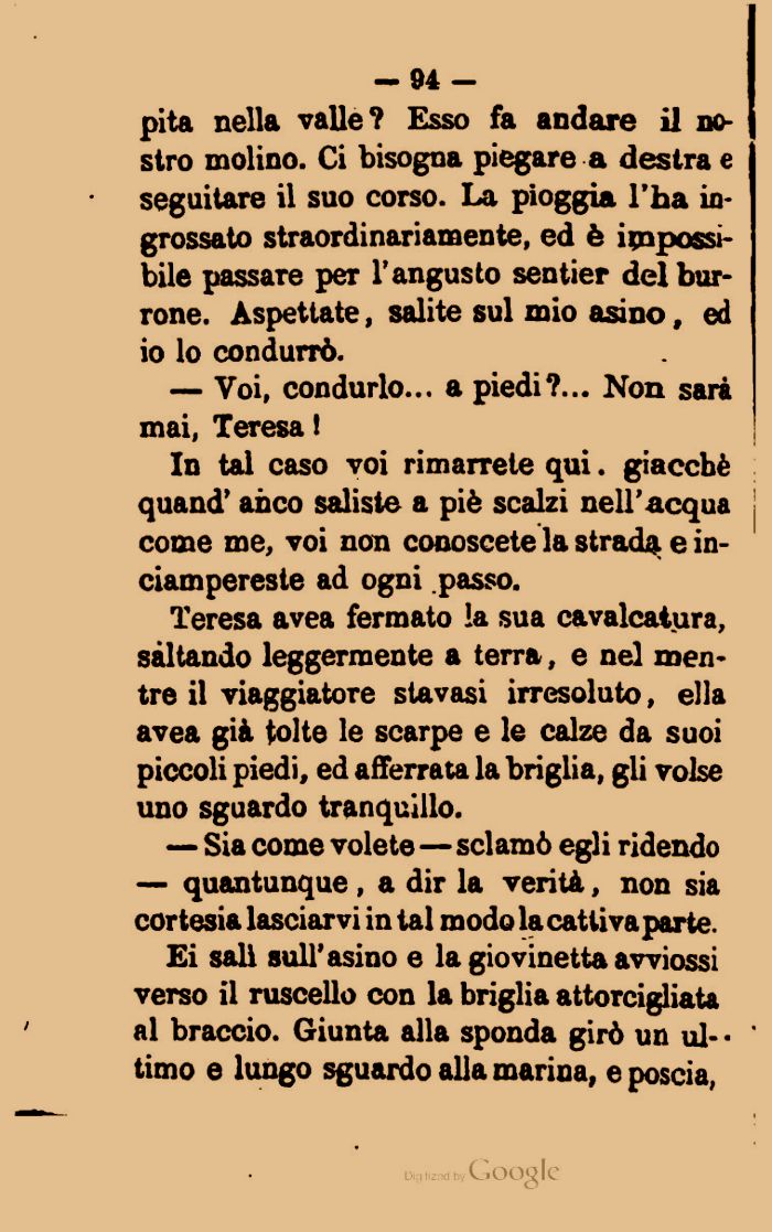 Teresa avea fermato la sua cavalcatura, saltando leggermente a terra, e nel mentre il viaggiatore s lavasi irresoluto, ella avea già tolte le scarpe e le calze da suoi piccoli piedi, ed afferrata la briglia, gli volse uno sguardo tranquillo.