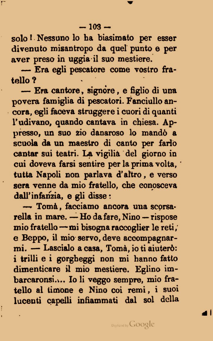 — Era cantore, signóre, e figlio di una povera famiglia di pescatori. Fanciullo ancora, egli faceva struggere i cuori di quanti l'udivano, quando cantava in chiesa. Appresso, un suo zio danaroso lo manḍ a scuola da un maestro di canto per farlo cantar sui teatri. La viǵlia del giorno in cui doveva farsi sentire per la prima volta, tutta Napoli non parlava d'altro, e verso sera venne da mio fratello, che conosceva dall' infanzia, e gli disse :