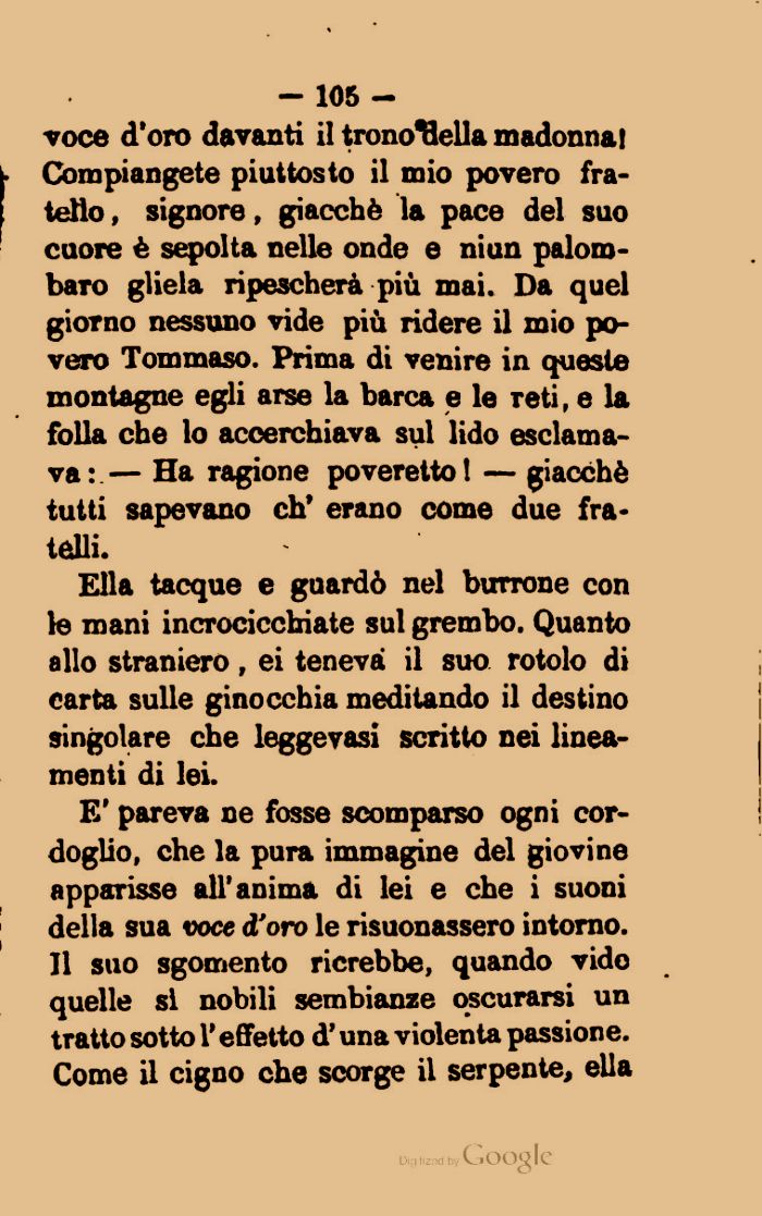 E' pareva ne fosse scomparso ogni cordoglio, che la pura immagine del giovine apparisse all'anima di lei e che i suoni della sua voce d'oro le risuonassero intorno. Il suo sgomento ricrebbe, quando vido quelle si nobili sembianze oscurarsi un tratto sotto l'effetto d'una violenta passione. Come il cigno che scorge il serpente, ella