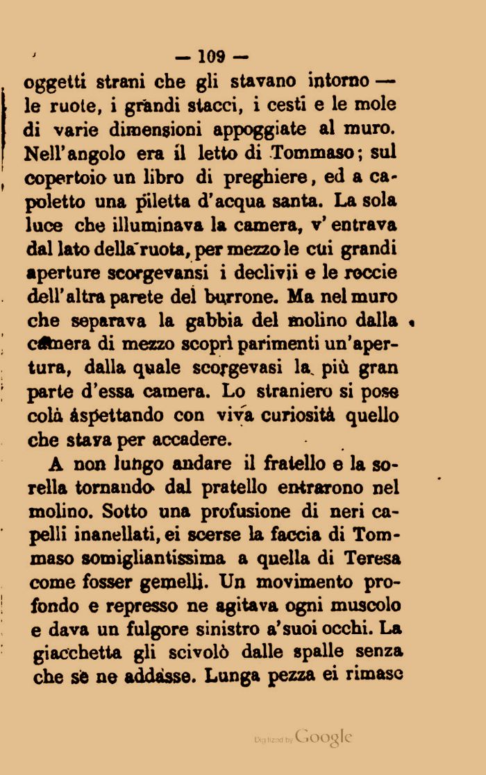 A non lungo andare il fratello e la sorella tornando dal pratello entrarono nel molino. Sotto una profusione di neri capelli inanellati, ei scerse la faccia di Tommaso somigliantissima a quella di Teresa come fosser gemelli. Un movimento profondo e represso ne agitava ogni muscolo e dava un fulgore sinistro a'suoi occhi. La giacchetta gli scivolò dalle spalle senza che se ne addasse. Lunga pezza ei rimase