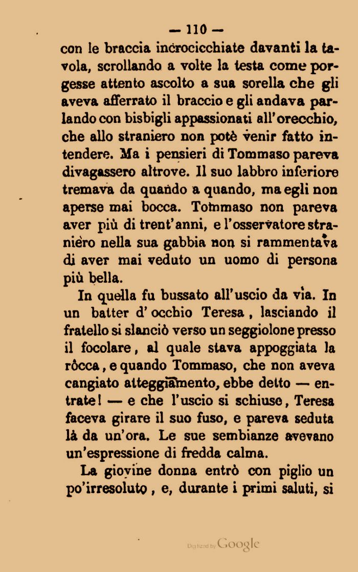 In quella fu bussato all'uscio da via. In un batter d' occhio Teresa , lasciando il fratello si slanciò verso un seggiolone presso il focolare, al quale slava appoggiata la ròcca, e quando Tommaso, che non aveva cangiato atteggiamento, ebbe detto — entrate! — e che l'uscio si schiuso, Teresa faceva girare il suo fuso, e pareva seduta là da un'ora. Le sue sembianze avevano un'espressione di fredda calma.