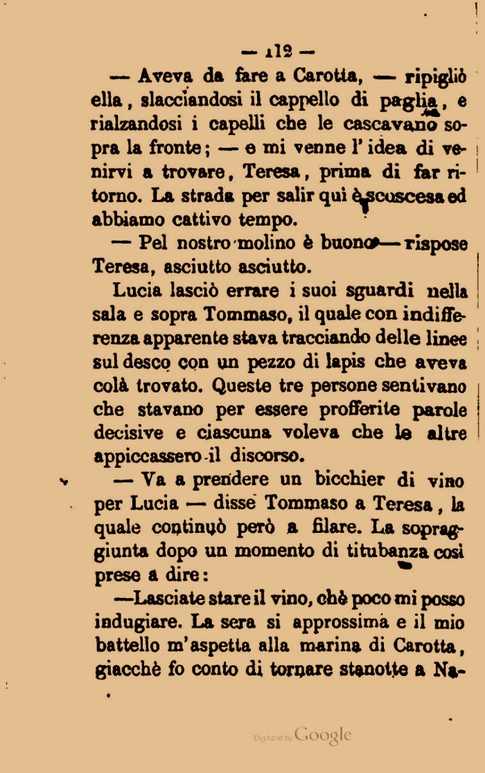 — Va a prendere un bicchier di vino per Lucia — disse Tommaso a Teresa, la quale continuò però a filare. La sopraggiunta dopo un momento di titubanza cosi prese a dire :