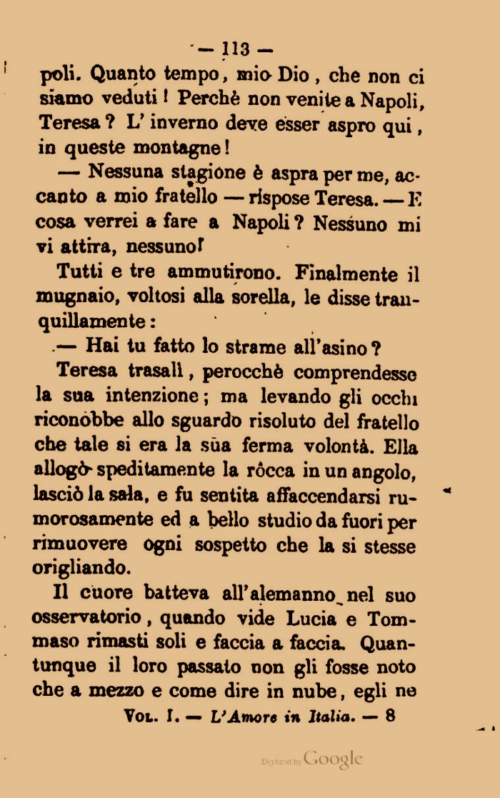 Il cuore batteva all'alemanno, nel suo osservatorio , quando vide Lucia e Tommaso rimasti soli e faccia a faccia. Quantunque il loro passato non gli fosse noto che a mezzo e come dire in nube, egli ne Voi. I. — L'Amore in Italia. — 8
