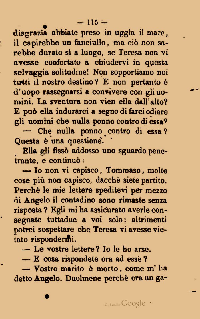 — Io non vi capisco, Tommaso, molte cose più non capisco, dacché siete partito. Perchè le mie lettere speditevi per mezzo di Angelo il contadino sono rimaste senza risposta ? Egli mi ha assicurato averle consegnate tuttadue a voi solo: altrimenti potrei sospettare che Teresa vi avesse vietato rispondenti.