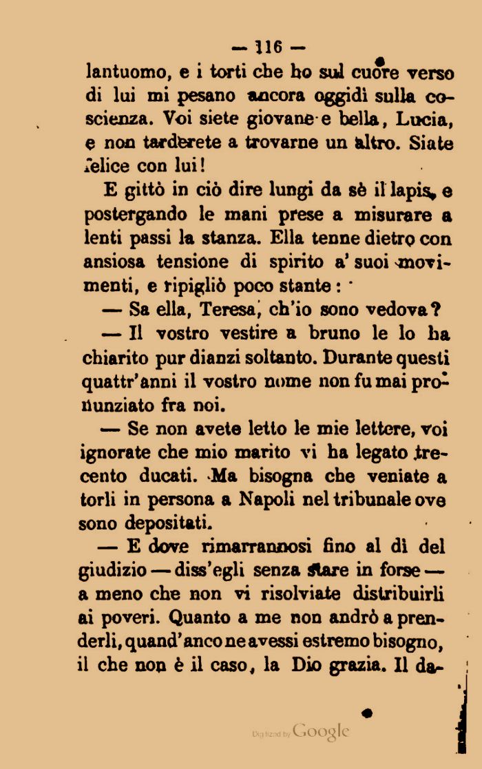 — Se non avete letto le mie lettere, voi ignorate che mio marito vi ha legato trecento ducati. -Ma bisogna che veniate a torli in persona a Napoli nel tribunale ove sono depositati.