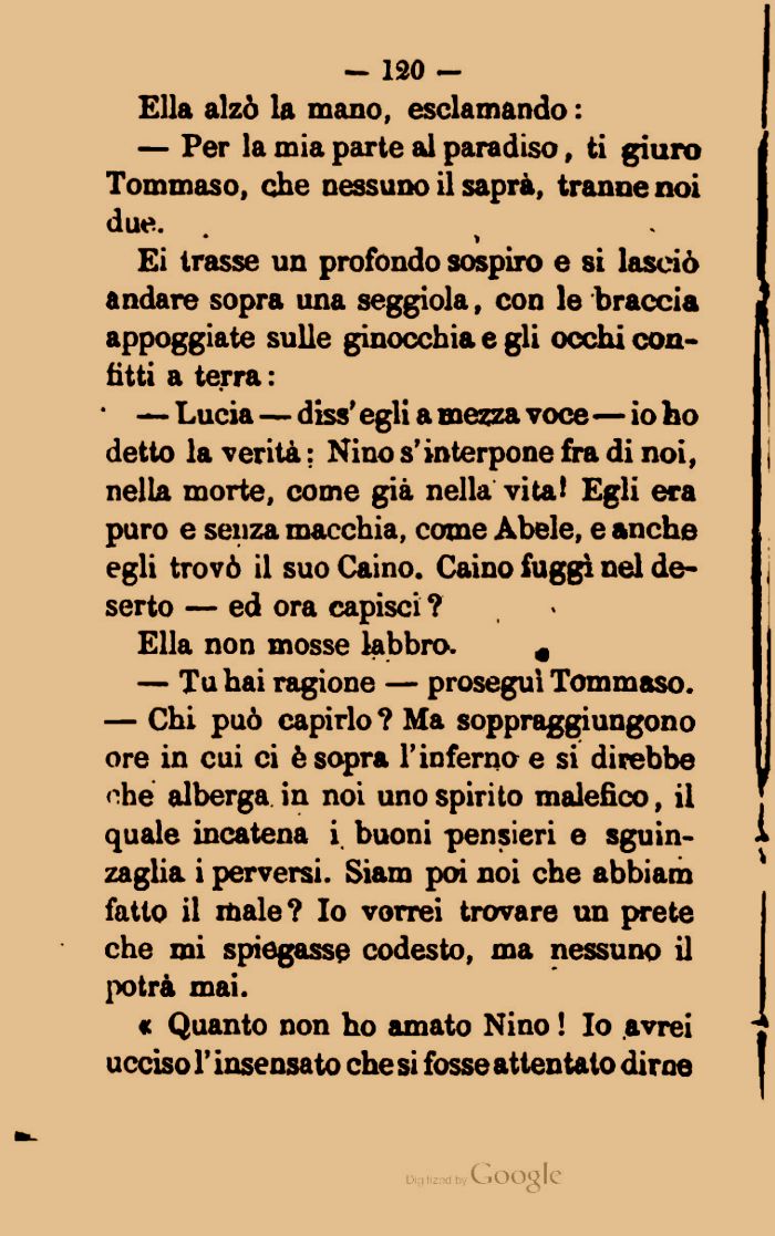• —Lucia — diss'egli a mezza voce—io ho detto la verità : Nino s'interpone fra di noi, nella morte, come già nella vita! Egli era puro e senza macchia, come Abele, e anche egli trovò il suo Caino. Caino fuggi nel deserto — ed ora capisci ?