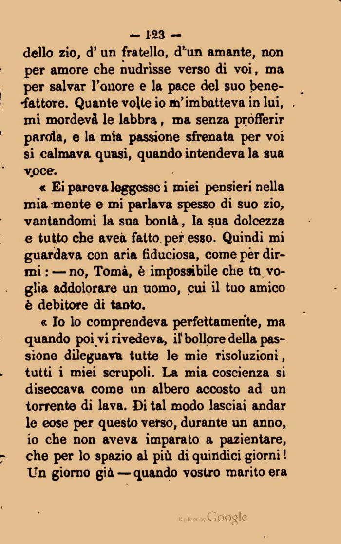 « Ei pareva leggesse i miei pensieri nella mia mente e mi parlava spesso di suo zio, vantandomi la sua bontà, la sua dolcezza e tutto che aveà fatto per esso. Quindi mi guardava con aria fiduciosa, come per dirmi : —no, Tomà, è impossibile che tu voglia addolorare un nomo, cui il tuo amico è debitore di tanto.