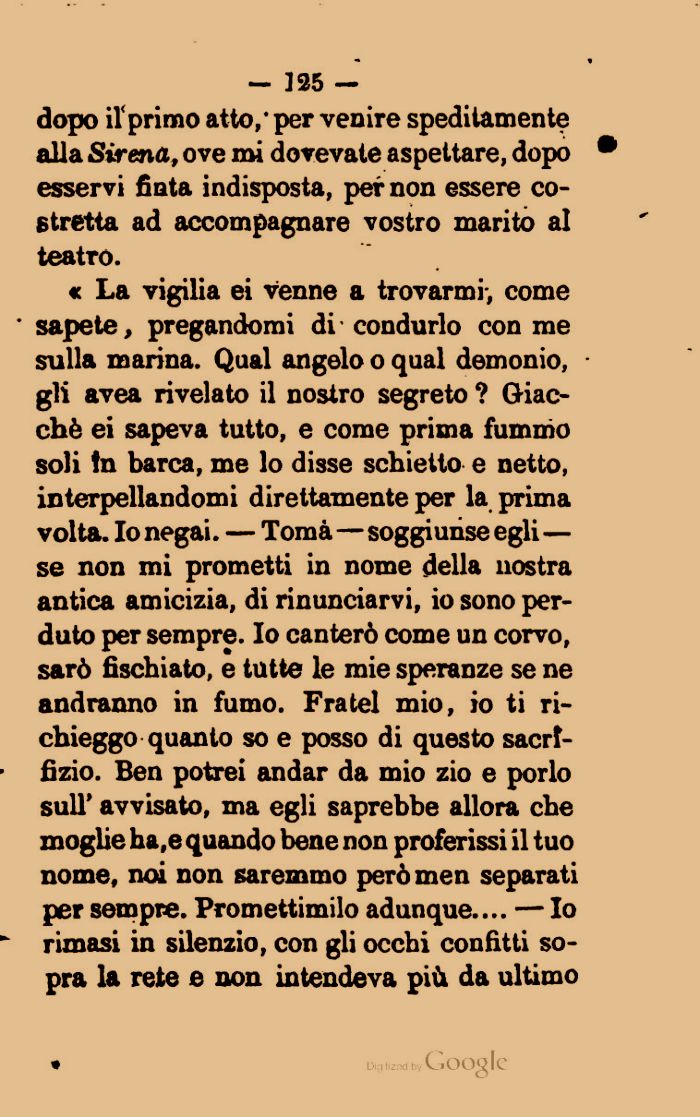 « La vigilia ei venne a trovarmi, come sapete, pregandomi di condurlo con me sulla marina. Qual angelo o qual demonio, gli avea rivelato il nostro segreto ? Giacché ei sapeva tutto, e come prima fummo soli tn barca, me lo disse schietto e netto, interpellandomi direttamente per la prima volta. Io negai. — Toma—soggiunse egli— se non mi prometti in nome della nostra antica amicizia, di rinunciarvi, io sono perduto per sempre. Io canterò come un corvo, sarò fischiato, e tutte le mie speranze se ne andranno in fumo. Fratel mio, io ti richieggo quanto so e posso di questo sacrifizio. Ben potrei andar da mio zio e porlo sull' avvisato, ma egli saprebbe allora che moglie ha,e quando bene non proferissi il tuo nome, noi non saremmo peròmen separati per sempre. Promettimilo adunque.... — Io rimasi in silenzio, con gli occhi confitti sopra la rete e non intendeva più da ultimo