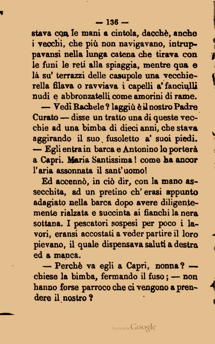 Ed accennò, in ciò dir, con la mano assecchita, ad un pretino eh' erasi appunto adagiato nella barca dopo avere diligentemente rialzata e succinta ai fianchi la nera sottana. I pescatori sospesi per poco i lavori, eransi accostati a veder partire il loro pievano, il quale dispensava saluti a destra ed a manca.
