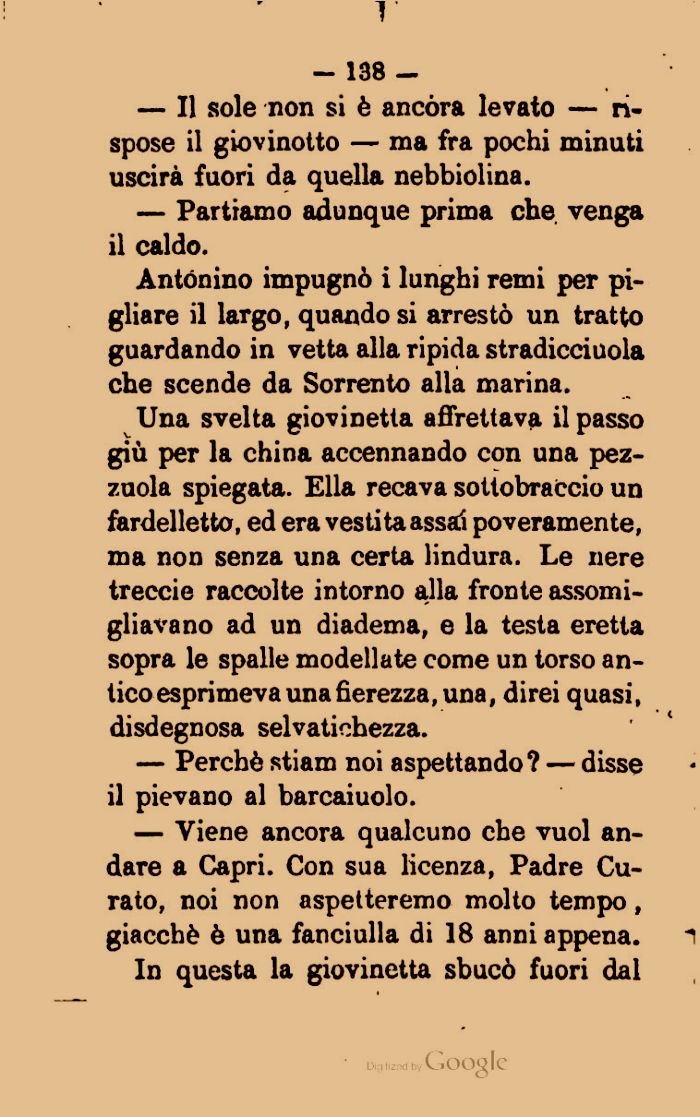 — Viene ancora qualcuno che vuol andare a Capri. Con sua licenza, Padre Curato, noi non aspetteremo molto tempo, giacché è una fanciulla di 18 anni appena. i