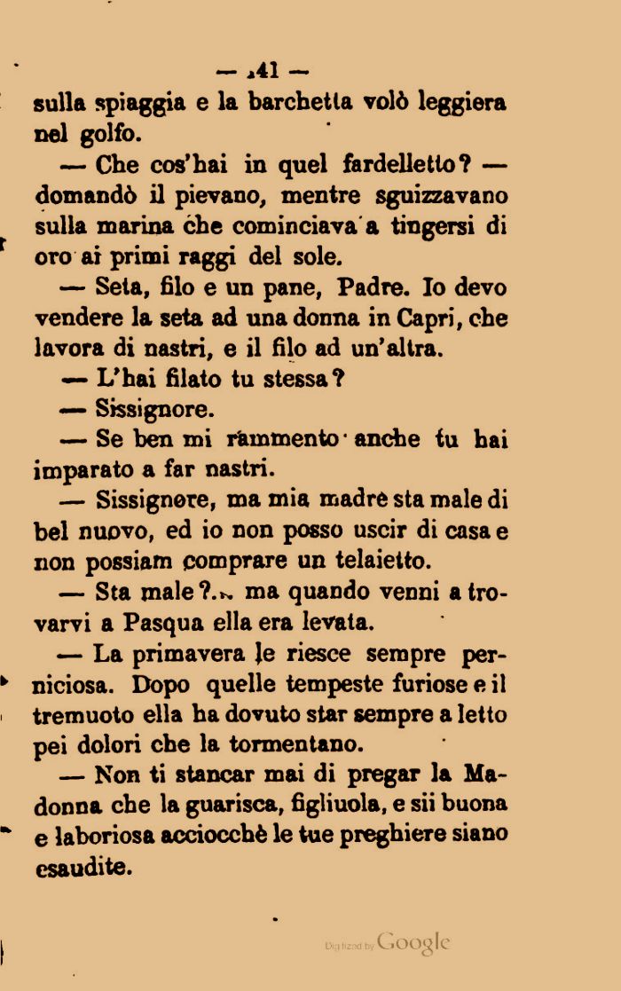 — Seta, filo e un pane, Padre. Io devo vendere la seta ad una donna in Capri, che lavora di nastri, e il filo ad un'altra.