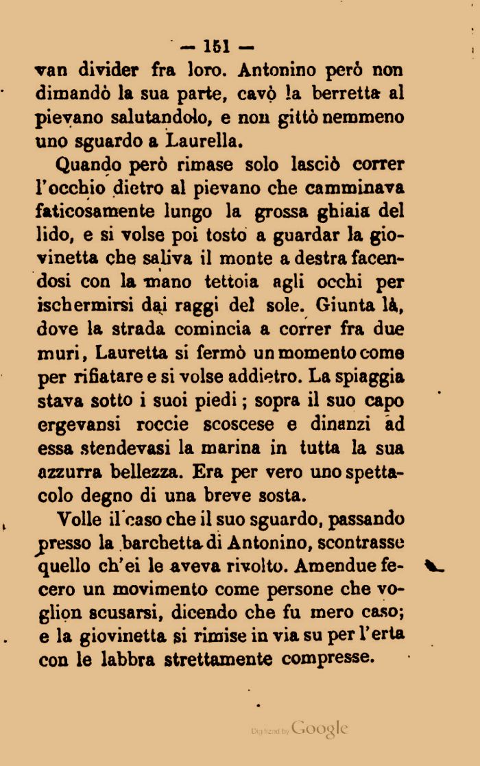 Quando però rimase solo lasciò corTer l'occhio dietro al pievano che camminava faticosamente lungo la grossa ghiaia del lido, e si volse poi tosto a guardar la giovinetta che saliva il monte a destra facendosi con la mano tettoia agli occhi per ischermirsi dai raggi del sole. Giunta là, dove la strada comincia a correr fra due muri, Lauretta si fermò un momento come per rifiatare e si volse addietro. La spiaggia stava sotto i suoi piedi ; sopra il suo capo ergevansi roccie scoscese e dinanzi ad essa stendevasi la marina in tutta la sua azzurra bellezza. Era per vero uno spettacolo degno di una breve sosta.
