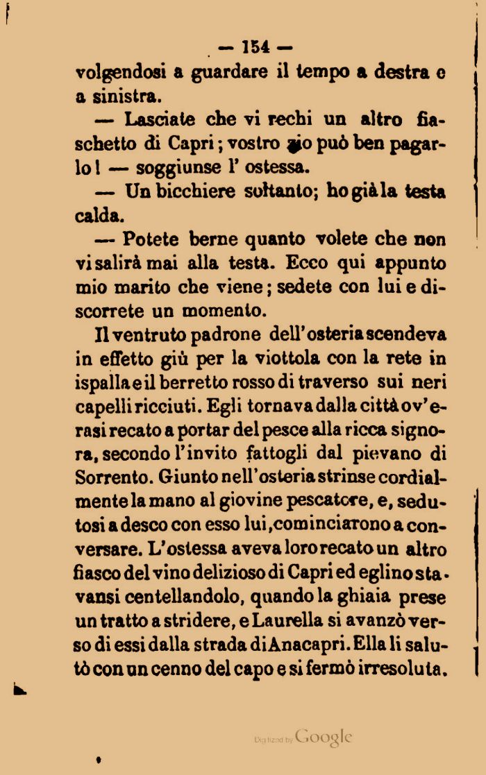 Il ventruto padrone dell'osteria scendeva in effetto giù per la viottola con la rete in ispallaeil berretto rosso di traverso sui neri capelliricciuti. Egli tornava dalla città ov'e-rasirecato a portar del pesce alla ricca signora, secondo l'invito fattogli dal pievano di Sorrento. Giunto nell'osteriastrinse cordialmente la mano al giovine pescatore, e, sedutosi adesco con esso lui,cominciarono a conversare. L'ostessa aveva lororecatoun altro fiasco del vino delizioso di Capri ed eglino sta • vansi cesellandolo, quando la ghiaia prese un tratto a stridere, e Laureila si avanzò verso di essi dalla strada diAnacapri. Ella li salutò conun cenno del capo e si fermò irresoluta.
