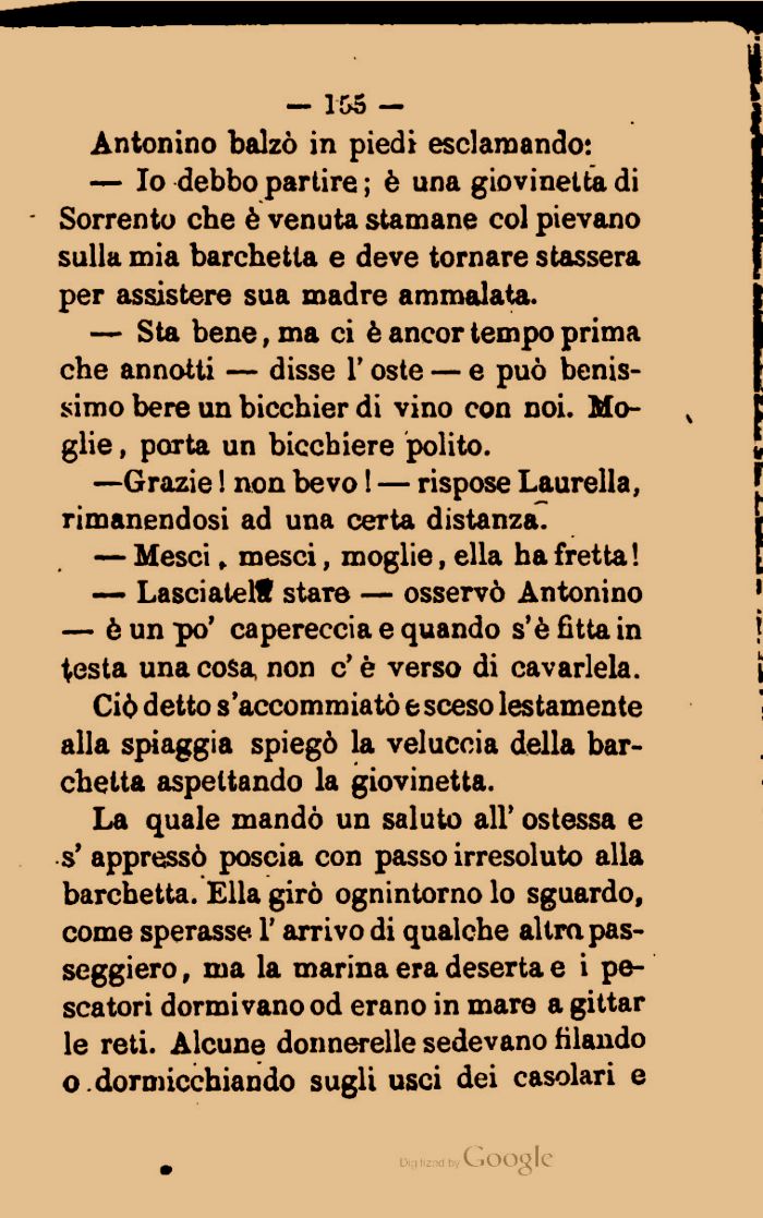 Ciò detto s'accommiatò e sceso lestamente alia spiaggia spiegò la veluccia della barchetta aspettando la giovinetta.