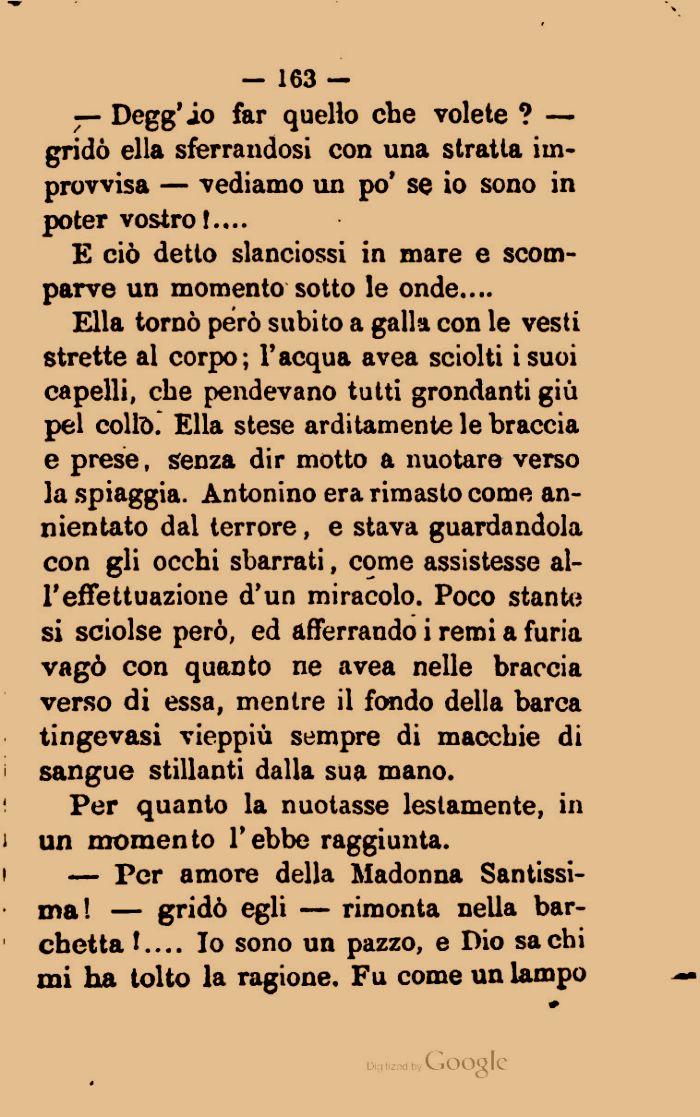 Ella tornò però subito a galla con le vesti strette al corpo; l'acqua avea sciolti isuoi capelli, che pendevano tutti grondanti giù pel colla. Ella stese arditamente le braccia e prese, senza dir motto a nuotare verso la spiaggia. Antonino era rimasto come annientato dal terrore , e stava guardandola con gli occhi sbarrati, come assistesse all'effettuazione d'un miracolo. Poco stante si sciolse però, ed afferrando i remi a furia vagò con quanto ne avea nelle braccia verso di essa, mentre il fondo della barca tingevasi vieppiù sempre di macchie di sangue stillanti dalla sua mano.