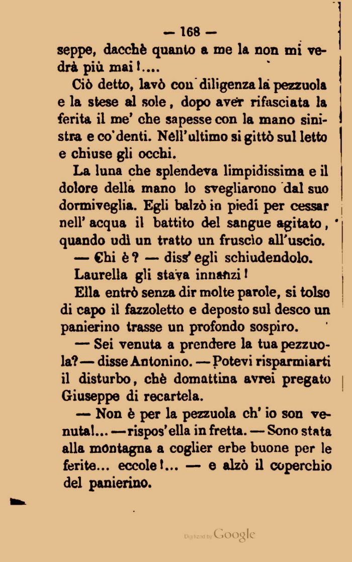 Ciò detto, lavò con diligenza là pezzuola e la stese al sole, dopo aveT rifasciata la ferita il me' che sapesse con la mano sinistra e co'denti. Nell'ultimo si gittò sul letto e chiuse gli occhi.