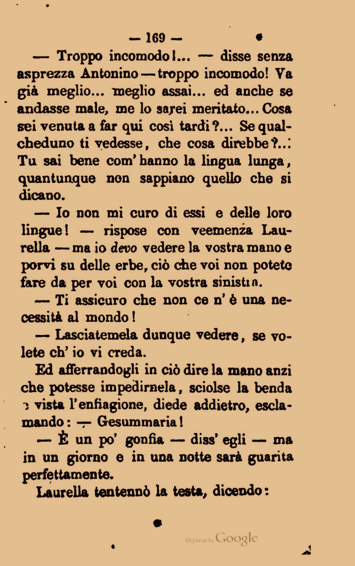 — Troppo incomodo I... — disse senza asprezza Antonino — troppo incomodo! Va già meglio... meglio assai... ed anche se andasse male, me lo sarei meritato... Cosa sei venuta a far qui così tardi ?... Se qual-cheduno ti vedesse, che cosa direbbe?..! Tu sai bene com' hanno la lingua lunga, quantunque non sappiano quello che si dicano.