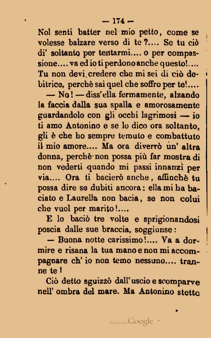 — No! — diss'ella fermamente, alzando la faccia dalla sua spalla e amorosamente guardandolo con gli occhi lagrimosi — io ti amo Antonino e se lo dico ora soltanto, gli è che ho sempre temuto e combattuto il mio amore.... Ma ora diverrò un' altra donna, perchè non possa più far mostra di non vederti quando mi passi innanzi per via.... Ora ti bacierò anche, affinchè tu possa dire se dubiti ancora: ella mi ha baciato e Laureila non bacia, se non colui che vuol per marito!....