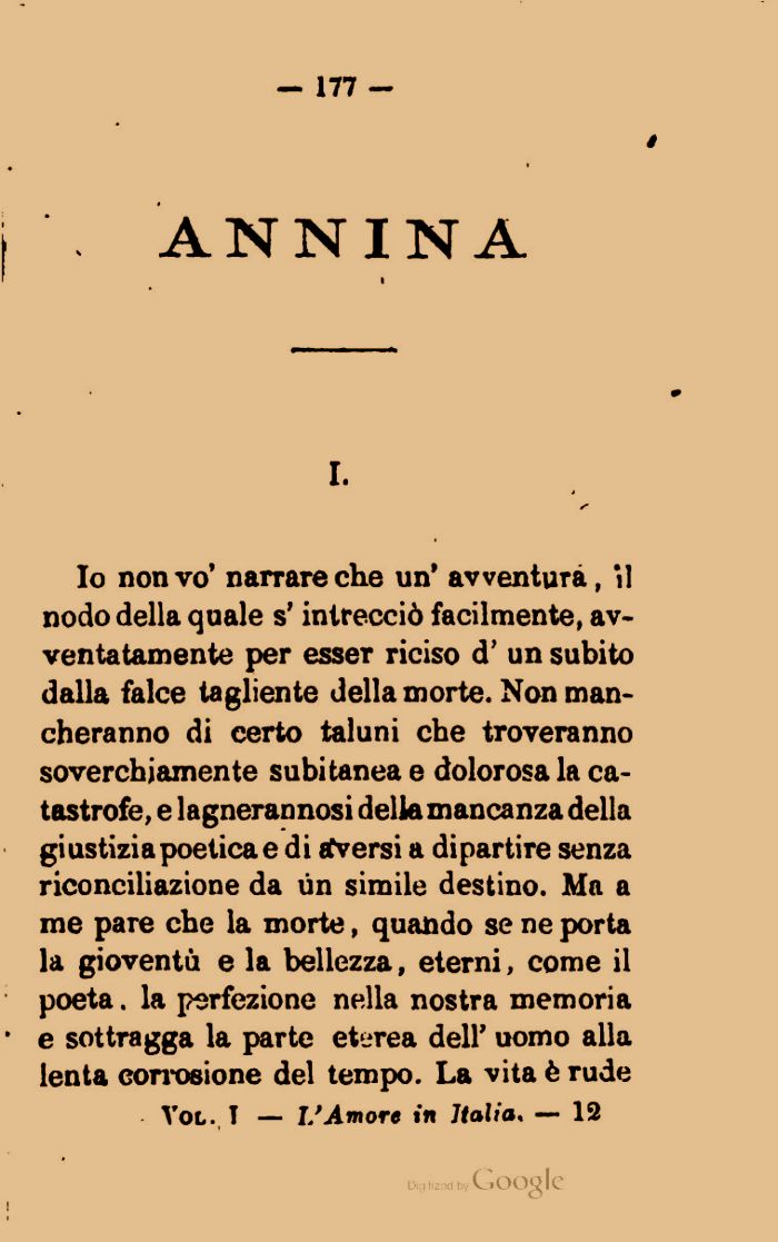 Io nonvo' narrare che un' avventura, il nodo della quale s'intrecciò facilmente, avventatamente per esser riciso d' un subito dalla falce tagliente della morte. Non mancheranno di certo taluni che troveranno soverchiamente subitanea e dolorosa la catastrofe, e lagnerannosi dellamancanza della giustiziapoeticaedi Aversi a dipartire senza riconciliazione da un simile destino. Ma a me pare che la morte, quando se ne porta la gioventù e la bellezza, eterni, come il poeta. la perfezione nella nostra memoria e sottragga la parte eterea dell' uomo alla lenta corrosione del tempo. La vita è rude Vol. I — VAmore in Italia, — 12