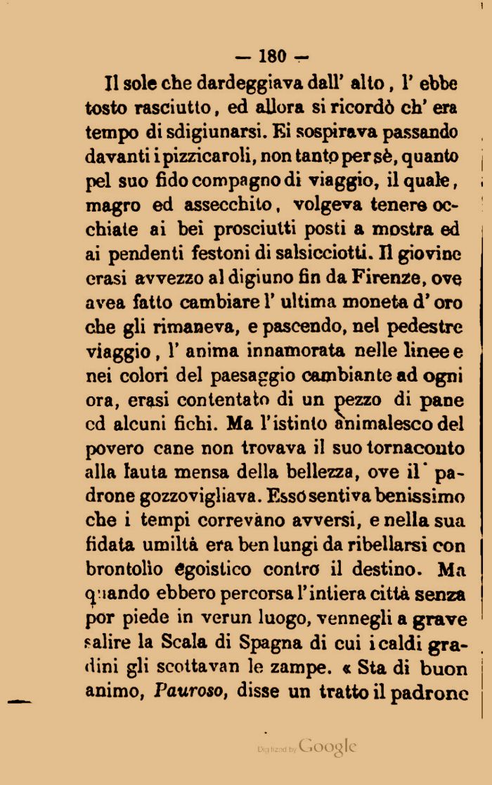 Il sole che dardeggiava dall' alto, 1' ebbe tosto rasciutto, ed allora si ricordņ eh' era tempo di sdigiunarsi. Ki sospirava passando davanti ipizzicaroli, non tanto per sč, quanto pel suo fido compagno di viaggio, il quale, magro ed assecchito, volgeva tenere occhiate ai bei prosciutti posti a mostra ed ai pendenti festoni di salsicciotti. Il giovine crasi avvezzo al digiuno fin da Firenze, ove avea fatto cambiare 1' ultima moneta d'oro che gli rimaneva, e pascendo, nel pedestre viaggio , 1' anima innamorata nelle linee e nei colori del paesaggio cambiantead ogni ora, crasi contentato di un ,>ezzo di pane ed alcuni fichi. Ma l'istinto animalesco del povero cane non trovava il suo tornaconto alla lauta mensa della bellezza, ove il' padrone gozzovigliava. Esso sentiva benissimo che i tempi correvano avversi, e nella sua fidata umiltą era ben lungi da ribellarsi con brontolio egoistico contro il destino. Ma quando ebbero percorsa l'intiera cittą senza por piede in verun luogo, vennegli a grave falire la Scala di Spagna di cui i caldi gradini gli scottavan le zampe. « Sta di buon animo, Pauroso, disse un tratto il padrone