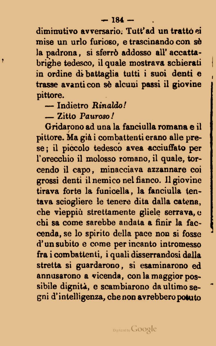 Gridarono ad una la fanciulla romana e il pittore. Ma già i combattenti erano alle prese ; il piccolo tedesco avea acciuffato per l'orecchio il molosso romano, il quale, torcendo il capo, minacciava azzannare coi grossi denti il nemico nel fianco. Il giovine tirava forte la funicella, la fanciulla tentava sciogliere le tenere dita dalla catena, che vieppiù strettamente gliele serrava, u ehi sa come sarebbe andata a finir la faccenda, se lo spirito della pace non si fosse d'un subito e come per incanto intromesso fra i combattenti, i quali disserrandosi dalla stretta si guardarono, si esaminarono ed annusarono a vicenda, con la maggior possibile dignità, e scambiarono da ultimo segni d'intelligenza, che non avrebbero potuto