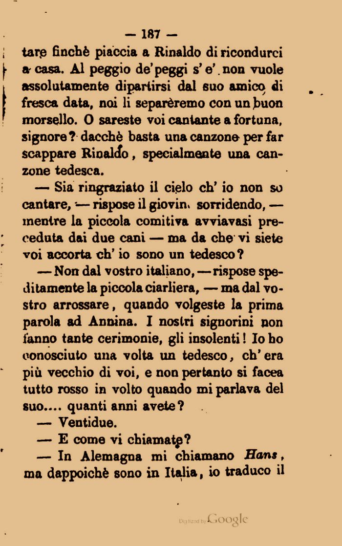 — In Alemagna mi chiamano Hans, ma dappoiché sono in Italia, io traduco il