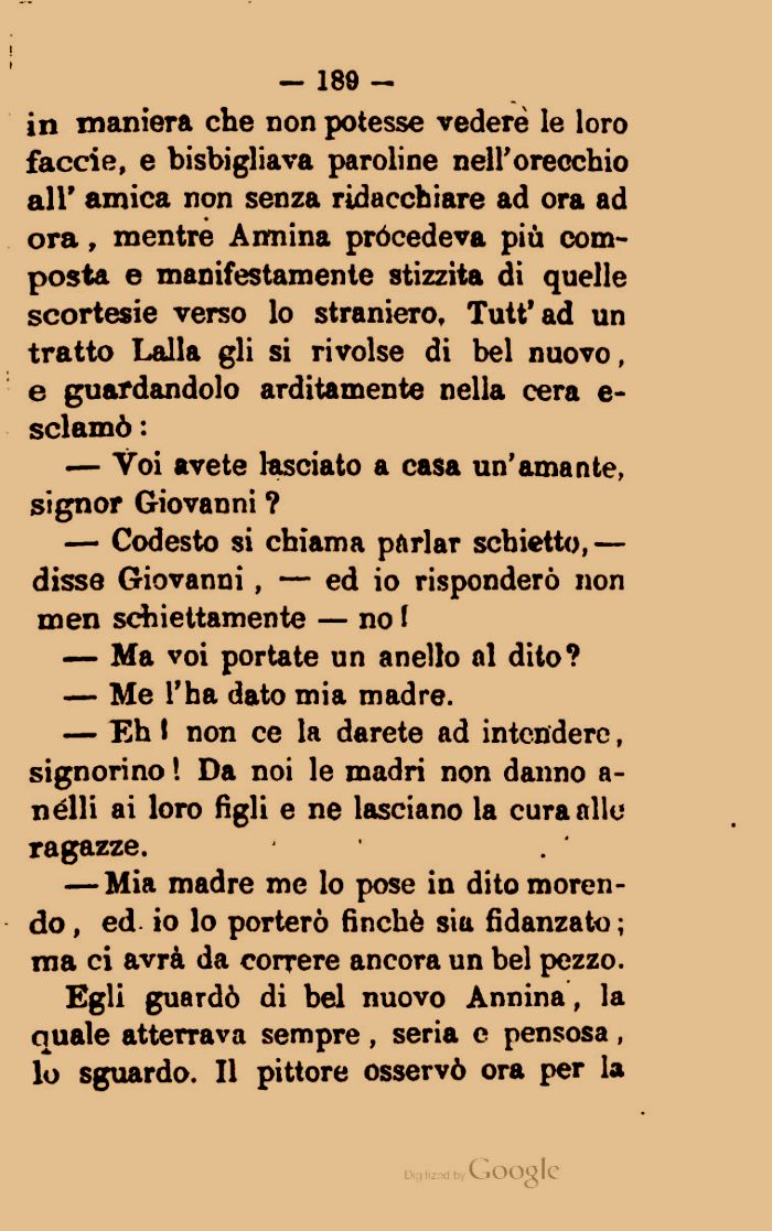 — Mia madre me lo pose in dito morendo , ed io lo porterò finché sia fidanzato ; ma ci avrà da correre ancora un bel pezzo.