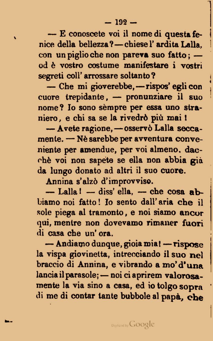 — E conoscete voi il nome di questa fenice della bellezza?—chiesel' ardita Lalla, con un piglio che non pareva suo fatto; — od è vostro costume manifestare i vostri segreti coli' arrossare soltanto?