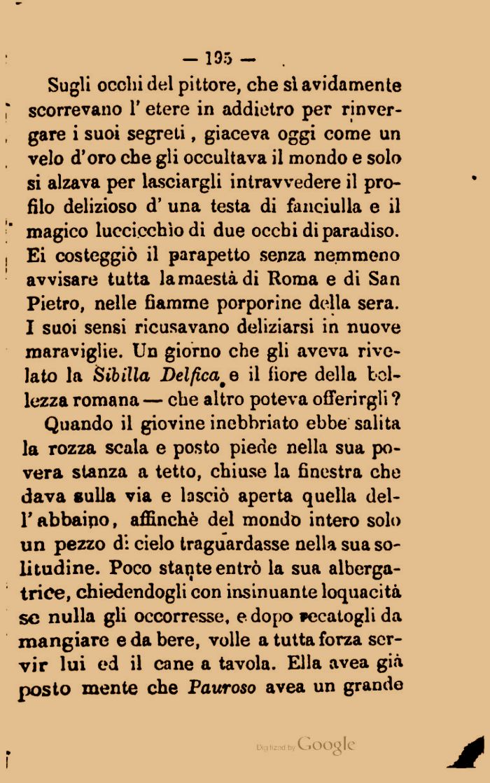 Sugli ocelli del pittore, che si avidamente scorrevano 1' etere in addietro per rinver-gare i suoi segreti, giaceva oggi come un velo d'oro che gli occultava il mondo e solo si alzava per lasciargli intravvedere il profilo delizioso d' una testa di fanciulla e il magico luccicchiodi due occhi di paradiso. Ei costeggiò il parapetto senza nemmeno avvisare tutta lamaestàdi Roma e di San Pietro, nelle fiamme porporine della sera. I suoi sensi ricusavano deliziarsi in nuove maraviglie. Un giorno che gli aveva rivelato la Sibilla Deificale il fiore della bellezza romana — che altro poteva offerirgli ?