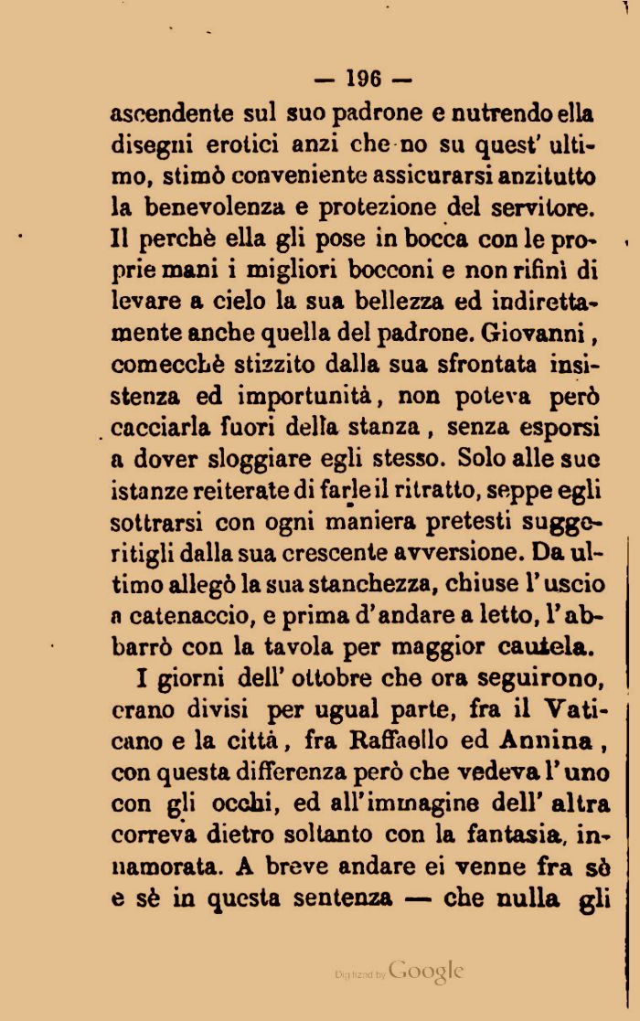 I giorni dell' ottobre che ora seguirono, erano divisi per ugual parte, fra il Vaticano e la città, fra Raffaello ed Annina , con questa differenza però che vedeva l'uno con gli occhi, ed all'immagine dell' altra correva dietro soltanto con la fantasia, innamorata. A breve andare ei venne fra sé e sè in questa sentenza — che nulla gli