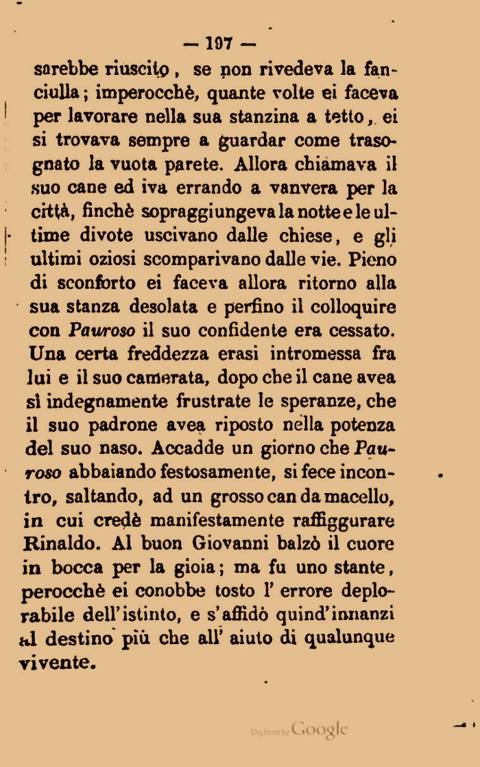 sarebbe riuscito . se non rivedeva la fanciulla ; imperocché, quante volte ei faceva per lavorare nella sua stanzina a tetto, ei si trovava sempre a guardar come trasognato la vuota parete. Allora chiamava il suo cane ed iva errando a vanvera per la città, finché sopraggiungeva la notte eie ul-j- time divote uscivano dalle chiese, e gli ultimi oziosi scomparivano dalle vie. Pieno di sconforto ei faceva allora ritorno alla sua stanza desolata e perfino il colloquire con Pauroso il suo confidente era cessato. Una certa freddezza erasi intromessa fra lui e il suo camerata, dopo che il cane avea si indegnamente frustrate le speranze, che il suo padrone avea riposto nella potenza del suo naso. Accadde un giorno che Pauroso abbaiando festosamente, si fece incontro, saltando, ad un grosso can da macello, in cui credè manifestamente raffiggurare Rinaldo. Al buon Giovanni balzò il cuore in bocca per la gioia ; ma fu uno stante, perocché ei conobbe tosto 1' errore deplorabile dell'istinto, e s'affidò quind'innanzi al destino più che all' aiuto di qualunque vivente.